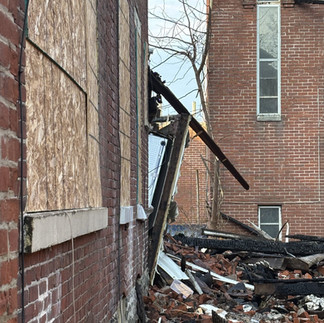 The first picture below shows a small part of our kitchen during the 1940's. Somewhere along the line, an L-shaped addition was added to the back of the home. The second photo of our refrigerator hanging out the side after the fire from the N Hanover Street view. The third photo is from the back/side of the house with the current tarp covering the refrigerator. The kitchen at some point was flipped - remember, when we first moved into the house, it was abandoned for 2.5 years. There really was nothing in the kitchen but an oven, a countertop on a pole, and a shoe rack hanging on the wall - I don't even remember a sink actually being there, nor was there a place to put a refrigerator! I believe the addition to the kitchen area was added in the 60's or 70's and was used back then for laundry, which we moved to the basement when we moved in. We obviously needed a space for the refrigerator, and it made the most sense - plus 5 kids' worth of laundry was never a good scene to be visible in our side kitchen!